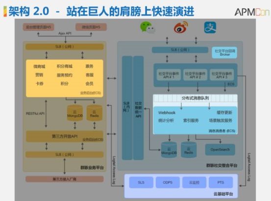 这是我们在2.0上做的一个调整,比1.0会稍微复杂一点点。右边是和微信、社会平台对接的一套系统。前面有公网的SLB,后面有API集群,这些集群会把数据直接打到分布式队列里面,会有不同的后台处理不同的事情。我们把串性做的事情全部并行化,该做统计分析的做统计分析,该做索引的做一些索引的服务,包括针对一些高并发的、读写要求比较高的地方做缓存的更新。底层会用到像SLS做日志相关的统计分析,当然也会用云上的一些性能测试工具,有一个新的服务上线或者说当我有一些活动的时候会通过云上的性能压测压一下整个系统的能力。网页端我们就做了一个模块化的调整,有微商城、积分商城、票务、服务预约所有的东西都是通过模块的方式有不同的团队专门维护,但是他们之间通过我们定义好的协议或者框架做支持,让他们可以并行的去迭代。