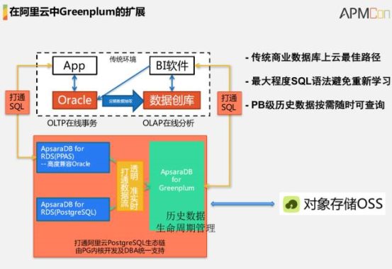 最后我们会发现一点,刚才有提到的一点是Greenplum现在的业务模型里面,在搭建Greenplum数据库的时候,我们会推荐用SSD的硬盘去搭建,因为它本身的分析处理能力很强,而且可以打散到每一台系统上面进行横向可扩充分析能力的处理。但是问题在于,如果你需要购买20台、30台,甚至50台、上百台的Greenplum服务器,而且每台服务器都是用SSD的硬盘进行数据存储,你的性能确实会很高,但是你的成本也有很大的压力。在阿里这边我们做了一件事情,如果是阿里云的云系统我们会提供一个Greenplum到OSS的数据流动功能,我们来看一下实际上Greenplum在阿里的整个体系中我们希望接入到什么样的业务场景。