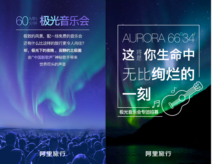 除此之外,阿里旅行还与阿里音乐合作,号召众多音乐人参与,历时一个半月,从百余首歌曲中,选出最富特色的极光主题曲,届时也将在极光音乐会上演唱。