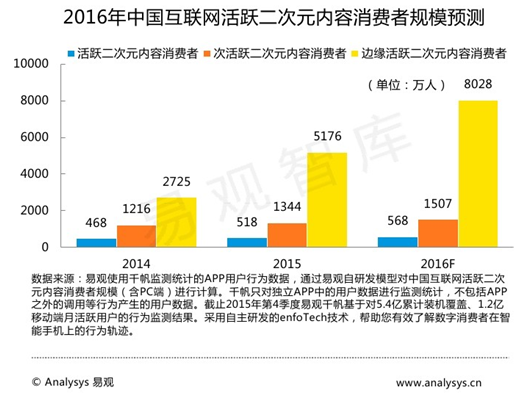 与此同时,以95后为消费主力军的二次元市场也迎来了最好的时代。易观智库发布的《2015-2016二次元产业专题研究报告》预测,2016年中国互联网活跃二次元内容消费者规模将达到568万人,边缘活跃二次元内容消费者规模将达到8028万人。更重要的是,二次元用户付费比例较高,据统计单个二次元用户每年平均消费超过1700元,粗略计算即可得出突破千亿元的市场规模。