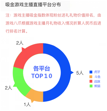 根据游戏八爪的统计,虎牙直播日均开播主播数超过2.2万人,比第二名多出1/3。在主播人气上,虎牙直播在综合收看人气、播出时长、粉丝数、观众总数以及百度指数等指标测算的TOP20游戏主播中占据半壁江山。而在吸金游戏主播TOP10中虎牙直播也是占半数。