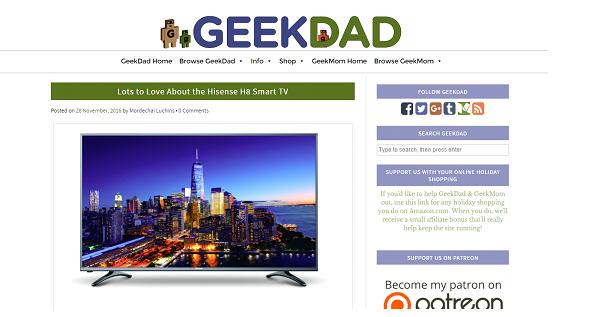 据一篇发布在北美极客测评网站GeekDad上的消费者点评称:之所以在众多4K电视产品中选中海信H8系列,并不是因为超薄机身外观,而是不同于其它产品的色彩表现。超出意料之外的屏幕表现,让他有种错觉:好像并不是在看一个视频,而是在透过窗户观察外边的世界。H8系列从色彩、锐度、亮度等多方面真实还原身边的世界。