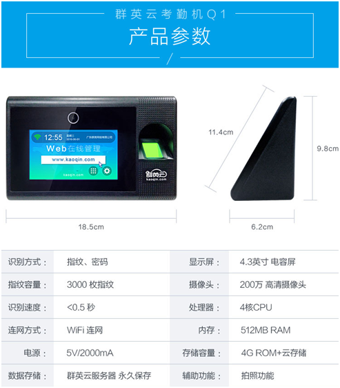 据了解,Q1指纹拍照网络考勤机是群英云考勤的首个自主研发产品,性价比极高,4.3寸大触摸屏使用起来极其方便,可以WiFi连网免布线非常简单方便,而且它还自带拍照功能,即打一次指纹就会拍下打卡人的样子,这样就完全避免了作弊嫌疑,避免让别人帮忙代打卡的情况出现。