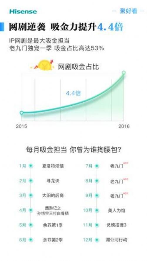 海信榜单显示,《老九门》蝉联七、八、九三个月的吸金榜首,在全年热门影视内容中的付费占比高达53%,是当之无愧的年度剧王。