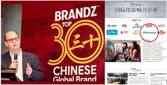 1月10日,WPP和凯度华通明略联手Google发布了首期“BrandZ中国出海品牌30强”排行榜及报告。而就在前一天,中国新闻社也公布“2016年度国际化影响力企业”榜单,海信均进入前10强。海信品牌海外影响和国际化品牌拉力正在快速提升。