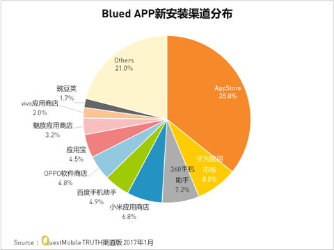 前面已经展示过,小恩爱用户年龄结构24岁以下、二三四线为主,Blued则为中年、一二线为主。反映在渠道结构上,抛开App Store,小恩爱以OPPO软件商店、应用宝为主打。Blued则以华为应用市场、360手机助手、小米应用商店为主打。区别还是很明显的。