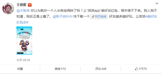 王祖蓝在微博中“调戏”大老师:你@大张伟 你以为就你一个人半夜定闹钟了吗?上“派派app”“偷”好友红包,根本停不下来。别人我不知道,我反正是上瘾了。
