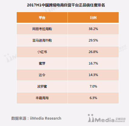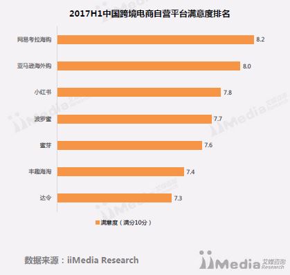 (图:艾媒咨询2017H1中国跨境电商自营平台正品信任度和平台满意度排名)