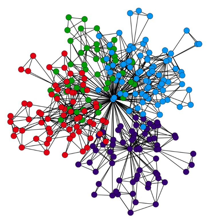 我们结合无监督学习+有监督学习方法来发掘羊毛党团伙作案的网络模型。首先,我们考察用户在一段时间内所有的订单相关数据的关系链,这些关系链构成一个总网络。接着,搜索网络中的所有子网络,进行连通图分割。再遍历每个子网络,获取网络标签,挖掘网络特征,最后,我们通过机器学习构建一个识别羊毛党的网络模型,图2就是一个典型的关联网络图。