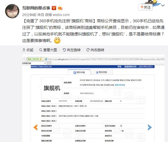 360为何要注册“旗舰机”这一商标?目前官方并未正式回复。网友评论调侃道:“全面屏这个通用名称都被抢注了,估计360手机此举也是被逼无奈才会出此下策,因为手机圈已经没什么能用的词汇了”。从网上爆料的截图来看,图片上并没有透露更多的信息,只显示了商标注册的申请人名称,显示为“奇酷互联网络科技(深圳)有限公司”。