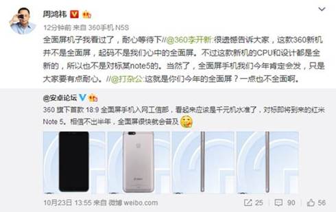 双十一大战刚结束,各大手机厂商还停留在晒战果晒成绩单忙的不亦乐乎的日子里,360手机选择在此时爆料并向全面屏手机施压,大有提醒同行回归理性竞争别再炒作的韵味。而网友则解读为360手机的言外之意或许是:“不就是个全面屏吗,有什么了不起值得天天炒作的,我360手机的全面屏产品也马上要上市了”。这并非是空穴来风,前不久,360手机总裁李开新在微博上回应某蓝V评论称“全面屏手机今年肯定会发布,只是大家要有点耐心”,360掌门人周鸿祎则称,自己已经看过全面屏机子了,请大家耐心等待下。眼看接近年关,360全面屏手机也将惊爆上市。