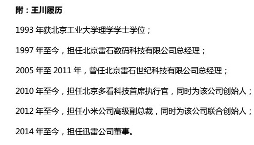 相关资料显示,迅雷新任董事会主席王川是小米联合创始人,多年来主导了小米旗下多项关键业务,并担任小米高级副总裁。自2014年3月后,王川一直担任迅雷董事。