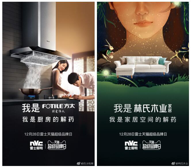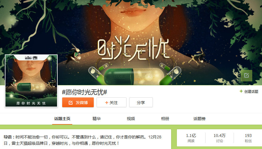 跨界品牌联合传播是此次雷士天猫超级品牌日的一大亮点,与以往邀请微博大V推广方式不同的是,雷士照明依托天猫超级品牌日平台,跨界携手知名品牌官方微博联动传播,合作伙伴有来自厨房电器领军品牌的方太、天猫家具销售第一品牌的林氏木业等,以一组“我是……解药”品牌联合宣传海报进行传播,不仅实现了传播效果最大化,更重要的是通过借助其他品牌力量,覆盖更多目标消费者,渗透知名品牌的主要消费群体。此外,雷士照明还在微博上发起#愿你时光无忧#话题,引导更多潜在消费者加入到活动讨论中,根据微博数据显示,相关话题阅读量达到了1亿+,讨论数量高达10万+。