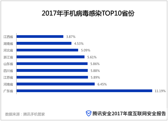 在手机端病毒感染用户地域特征分布上,广东省向来排名靠前,2017年也仍未摆脱手机病毒大省的标签。根据腾讯手机管家的病毒拦截数据显示,2017年手机病毒感染用户量整体呈下降趋势,总数为1.88亿,相较2016年同比下降62.4%。其中广东省用户感染手机病毒占比第一,高达11.19%。