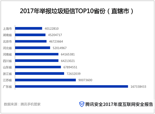 在国家政策和安全厂商的共同努力之下,用户主动参与打击骚扰诈骗的热情不断提升,通过举报、标记骚扰诈骗电信和电话逐渐成为其有力武器。根据报告显示,2017年,腾讯手机管家共收到用户举报垃圾短信数13.8亿条。在垃圾短信的地域省份分布方面,用户举报垃圾短信最多的前三省份分别为广东、江苏和浙江,其中广东省举报垃圾短信数达1.67亿。