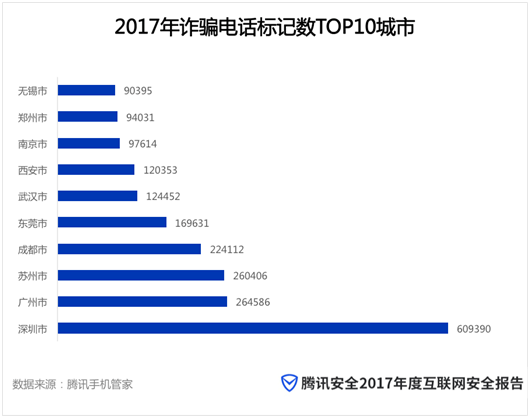 而在危害性更大的诈骗电话方面,骗子们针对的目标地域更为明确,主要以东部沿海经济发达地区与内陆中心省份为主。其中深圳是诈骗电话标记数最多的城市,总数达60.9万,广州和苏州分别以26.4万和26万的标记数紧随其后。