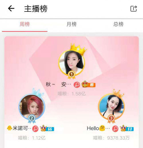 本周获得周榜(10.22-10.26)冠军的主播是“安妮宝贝”,获得喵粮1.58亿,折合人民币价值约16万元。