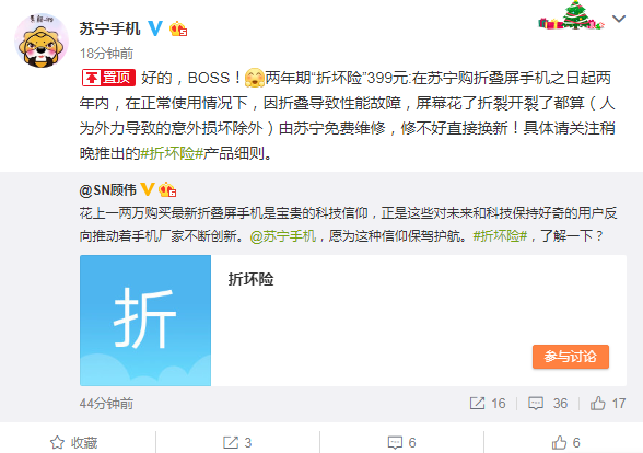 针对火爆全球的折叠屏手机新品,苏宁手机也在2月26日率先推出“折坏险”,两年期399元:在苏宁购折叠屏手机之日起两年内,在正常使用情况下,因折叠导致性能故障,屏幕花了折裂开裂了都算(人为外力导致的意外损坏除外)由苏宁免费维修,修不好直接换新,这款“折坏险”服务产品可以说是为三星Galaxy Fold定制,用户购买折叠屏手机产品,可以省去后顾之忧,放心尽情折叠。