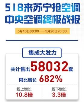 苏宁的中央空调新政策对于不良经销商和跑单帮具有“釜底抽薪”的作用,不但动了他们现在的“奶酪”,更让他们未来无“奶酪”可吃,受到他们的非议和抵制也就在所难免了。但用户的双眼却是雪亮的,用信任的订单给苏宁中央空调提供了坚定的支持。日前,苏宁中央集成公司发布“518空调万人抢”战报,截至5月20日,苏宁全线共计售出58032套中央空调,同比增长682% ,其中线下增长3.3倍,线上增长10.8倍,可谓是盛况空前。618期间,苏宁中央空调维保政策全面升级,想必又将迎来一场中央空调的线上线下狂欢。