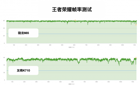 而相同画面设置下,同样视角运行同一局游戏,采用K710芯片的手机平均帧率54.3fps,在遇到团战或者施放画面效果较为复杂的技能时,会出现不同程度的掉帧卡顿。