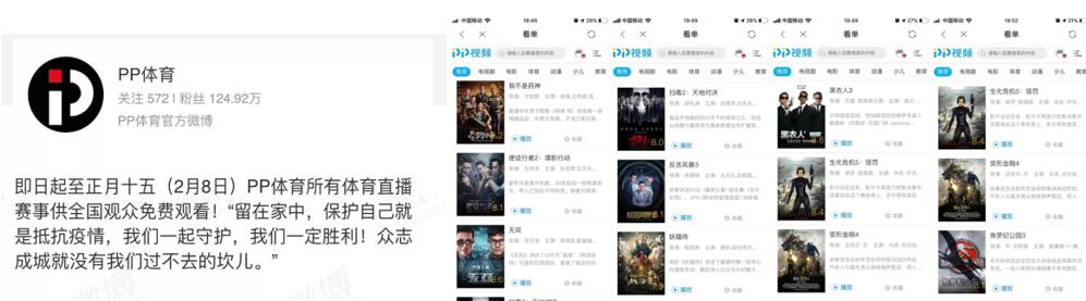 为鼓励消费者居家抗击疫情,苏宁旗下多家内容平台推出了免费开放热门赛事、电影、电视剧等内容的措施。苏宁旗下PP体育1月25日宣布开通了直播赛事的绿色通道,到2月8日间,所有赛事用户都可免费观看。