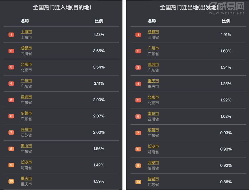 与此同时,据百度地图迁徙大数据平台最新数据显示,2月5日全国热门迁入地仍主要集中于一线城市、区域中心城市及劳动力密集城市。前5名依次是:上海、成都、北京、广州、深圳。排名第一的上海市,迁入人数占全国总迁入人数的4.13%。迁出方面,全国热门出发地前5名依次是:成都、广州、深圳、重庆、北京。迁出人数占比最多的城市是成都市,出发人数占全国总出发人数的1.91%。成都作为人口迁入、迁出的双向枢纽特征明显。