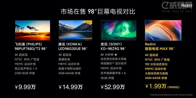 2020年3月24日,Redmi智能电视MAX 98”正式发布,其采用一块98英寸屏幕,实际尺寸比一张单人床还要大。因为其大尺寸的特性,小米还专门为其推出了一站式的尊享VIP定制化送装服务,让购买此款电视的用户完全无后顾之忧。同时它还搭载分区动态背光技术,拥有超高动态对比度,整体显示效果非常出众。Redmi智能电视MAX 98”的售价仅19999元,将于4月9日10点在小米商城和小米之家首卖,并且支持企业团购。