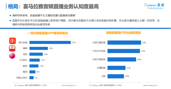 易观是国内领先的大数据公司,其在2019年中国音频直播产业发展报告中调研得出,喜马拉雅在音频内容生态健全、内容培训体系健全、内容细分和多元化、版权优势、内容及流量扶持有着无可比拟的优势,在完善的生态系统加持下,喜马拉雅直播行业认知度最高。