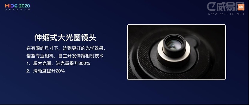 MIDC2020期间,小米集团副总裁、手机部总裁曾学忠也带来了小米手机在相机功能上的最新预研成果。近些年,相机画质一直是手机厂商关注的重要性能之一。从传统相机设计中汲取灵感,小米带来了最新自主开发,伸缩式大光圈镜头技术。 结构方面,采用直立式可伸缩光学设计,通过伸缩结构轻松收纳于手机之中,即用即开,伸缩之间瞭望远方。