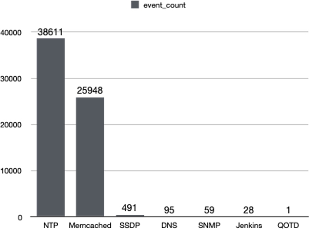 而在攻击手段统计方面,春节假期期间,在进行反射放大 DDoS 攻击时,攻击者倾向于利用有漏洞的 NTP 和 Memcached 服务进行攻击。在所观测到的全部反射放大 DDoS 攻击事件中,不同攻击手段所对应攻击事件数如图4所示: