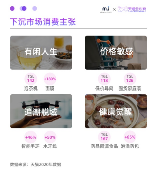下沉市场用户的消费主张可以用有闲人生、价格敏感、追潮脱域和健康觉醒四点概括。下沉用户拥有更充裕的闲暇时间来花钱愉悦自己。同时物美也要价优,囤货装更能打动下沉用户。在信息爆炸和高速跨域流转中,驱动了下沉用户摆脱地域线下空间的束缚,追求比肩高线都市人群的生活方式,比如智能手环、水牙线的增长均接近50%。随着疫情的持续,下沉用户对生活稳定性的预期有一定的打破,健康意识得到进一步的唤醒,例如药品同源食品、泡澡药包等增长显著。