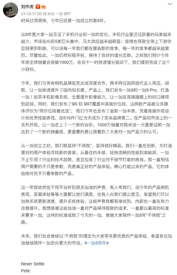 在全球多地区市场高速增长下,一加顺利完成了千万销量的目标。刘作虎表示“1000万销量对我来说一方面是证明一加达到了一个新的销量级,更重要的是让我看到了大家对一加产品力的认可。”