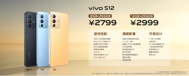 全新一代先锋影像旗舰vivo S12,8GB+256GB版本,2799元,12GB+256GB版本,2999元;vivo S12 Pro,8GB+256GB版本,3399元,12GB+256GB版本,3699元。即日起在vivo官网、官方体验店、京东、天猫、苏宁,以及线下各类合作门店全面开售。