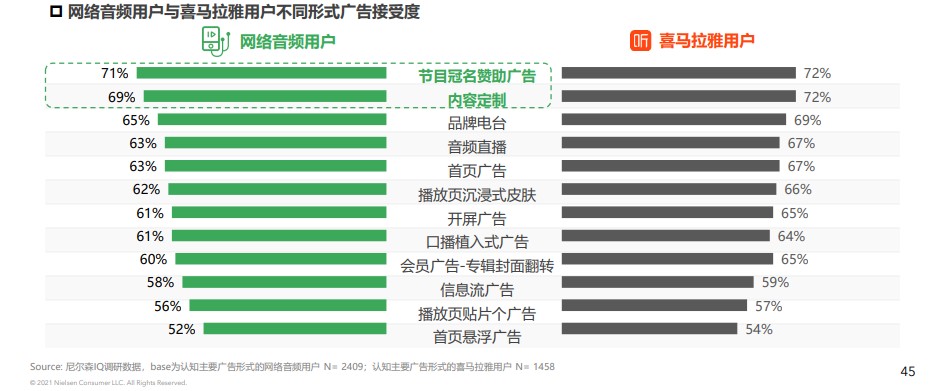 尼尔森指出,相比于网络音频受众,喜马拉雅用户对各类型音频有声广告及可视化广告的接受度均更加突出。