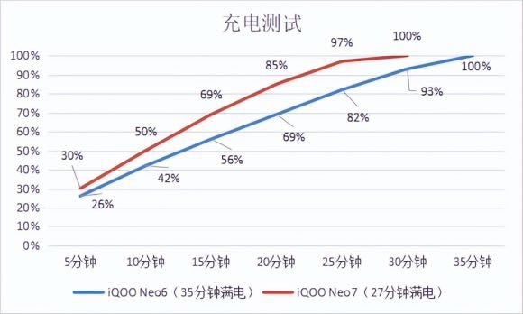 充电环节上,从1%电量充至100%电量,iQOO Neo7耗时27分钟,平均一分钟可充进约185.18mAh的电量,iQOO Neo6耗时35分钟,平均一分钟则充进约134.28mAh的电量。不难发现,iQOO Neo7无论是续航表现还是充电效率,都比iQOO Neo6更胜一筹。