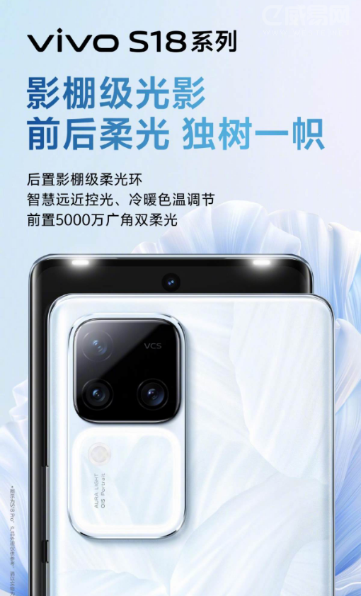 这次vivo官方表示S18系列搭载了影棚级别的人像摄影,机身背面后置了影棚级别的柔光环,支持智慧远近控光和冷暖色温调节,能做到自动匹配冷暖柔光和智能调节补光亮度,让人像拍摄成片更具质感更加柔和。
