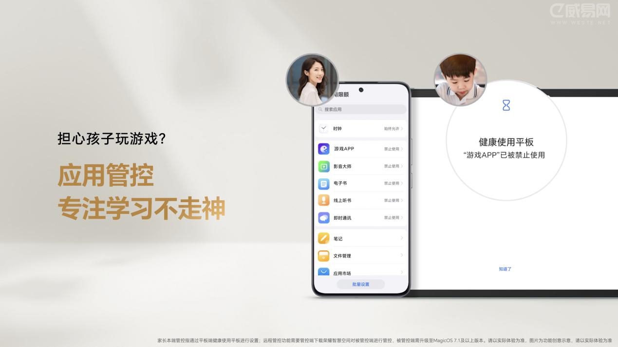 针对青少年自控能力相对薄弱,容易沉迷游戏、短视频等痛点,荣耀平板9推出APP使用名单设置功能。在儿童模式下,家长可以仅授权部分APP给孩子使用,以此有效管理孩子使用平板的时长、时段和应用等。家长端还可通过荣耀智慧空间APP操作,实现远程管控。此外,荣耀平板9还内置学情报告功能,家长在手机端可以查看孩子的平板使用情况。哪怕不在身边,家长也能时刻守护陪伴。