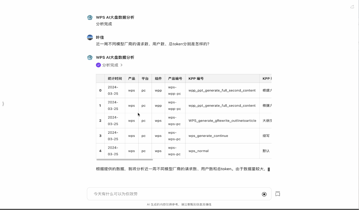 图:以上为基于商汤“日日新”延伸出代码模型能力打造的WPS 大盘数据分析应用,通过对话就能完成数据理解与分析任务。