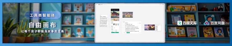 首先,我们打开百度APP,搜索“智能写作”等关键词,就可以找到“自由画布”智能体,它可以帮你完成从找资料、到编辑、再到生成和分享的全部任务。
