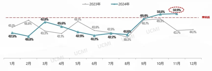 2024年12月2日,中国汽车流通协会发布新一期“中国二手车经理人指数”(UCMI)。本期UCMI结果显示,11月份二手车经理人指数为51.9%,同比增长8.2个百分点,环比增长0.3个百分点,反映出11月二手车市场延续上月向好趋势,市场仍处于景气区间。