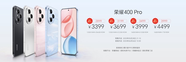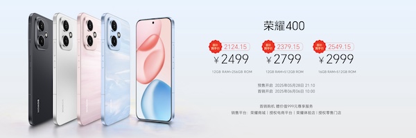 据了解,荣耀400系列共两个版本,分别为荣耀400与荣耀400 Pro,国补后起售价分别为2124.15元、2899元,目前已经开启预约,6月6日10:00全渠道正式开售。