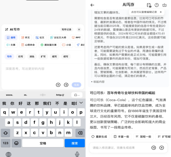 对于需要经常撰写文案的人来说,夸克的 AI 写作功能简直是福音。无论是工作中的报告、策划方案,还是创作一篇小说、散文,它都能大显身手。