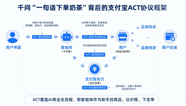 ACT 协议的诞生正是为破解这些问题而来。支付宝为其搭建了 “委托授权域”“商业交互域”“支付服务域”“信任服务域” 四大核心基础设施标准,实现 AI 操作全流程可追溯、可验证,让人更放心;支持自动化交易流程,减少不必要的人工干预,提升服务效率;统一多平台服务标准,避免体验的割裂。