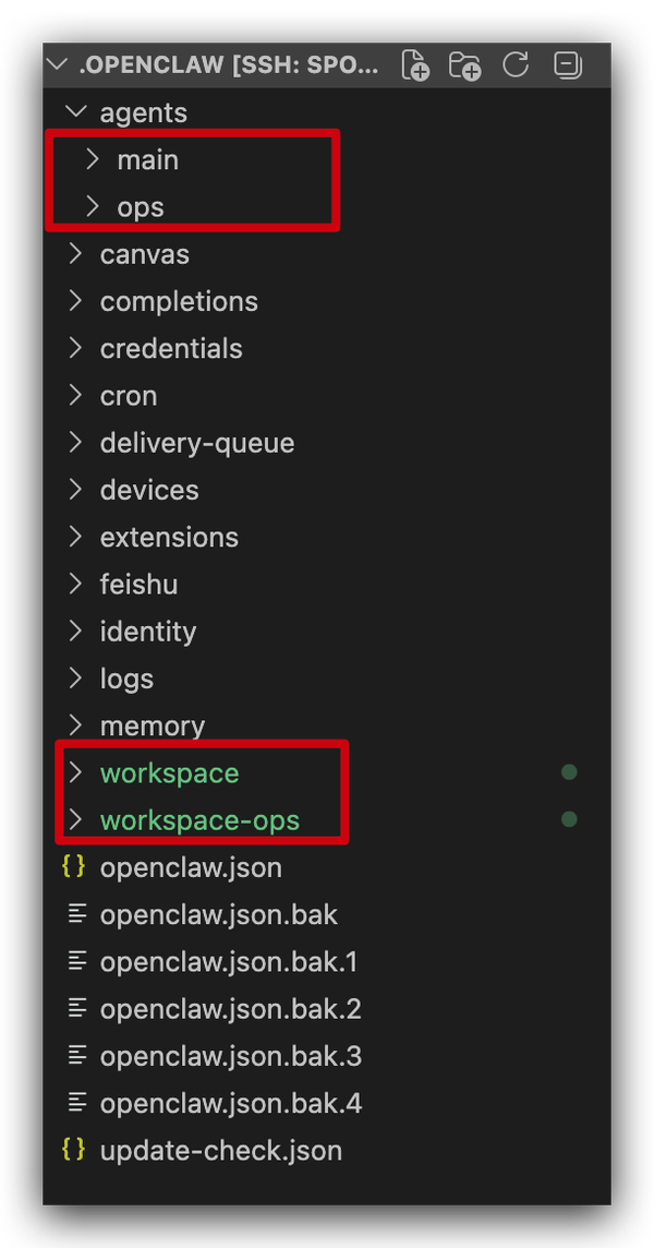 当然,如果你足够熟练,以上步骤也可以直接在openclaw.json中修改(见\"list\"下添加的\"ops\"相关内容):