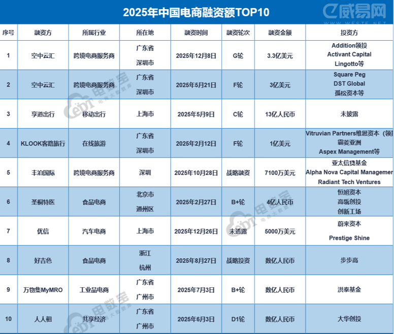 2025年电子商务融资额排名前十的有:空中云汇、享道出行、客路旅行、丰泊国际、圣桐特医、优信、好吉色、万物集MyMRO、人人租,前十总融资金额约81.2亿元,占整体融资金额的71.47%。
