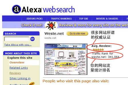 一段日子以来,Alexa.com做为第三方统计网站的权威认证,被国内一些网站(包括个人网站和众多门户媒体网站)拿来说明自己网站的实力。常常在某些网站上会看到这样的说明:“国际消息:据亚马逊网站(www.amazon.com)麾下的Alexa.com的最新资料显示,XX网站在Alexa全球用户中的被评为☆☆☆☆☆级。”