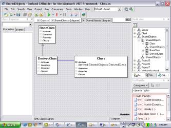 Finally, C#Builder Architect edition has integrated Together UML modeling technology into the IDE. This provides a design-time capability where developers and architects may build UML models and the underlying code is updated. Similarly, code changes update the UML model immediately. There is no intermediate translation or representation of the model, which means there is direct interaction between code and model. VS .NET Architect has Visio, but the capability doesn't even compare.