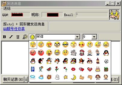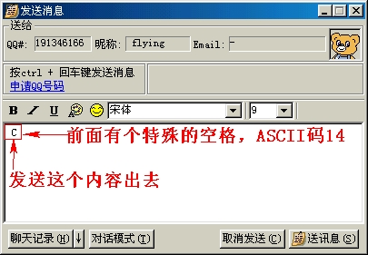 所以,我们只要在代表相应表情的字符前加上个ASCII码14就可以了,在QQ中ASCII码14看起来就是一个特殊的空格,我们无法直接输入得到它。如果不用其他软件,你可以这样得到这个特殊的空格:给QQ好友发送一个表情,然后点“聊天记录”按钮,在聊天记录里面就有那个符号。复制它到发送消息窗中,就得到了这个特殊的空格。现在输入M试试(特殊空格复制到记事本中看起来就是黑方块:),对方一定会收到一个吐舌头的表情符号,呵呵!