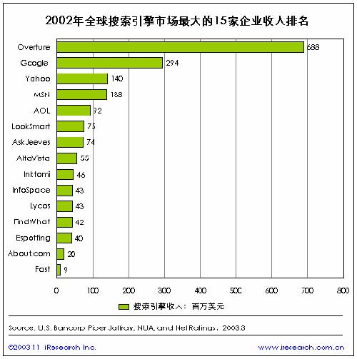 据U.S. Bancorp Piper Jaffray发布的搜索引擎市场研究报告表明,2002全球搜索引擎市场总收入为17.99亿美元。其中前收入前四位依次为Overture、Google、Yahoo、MSN Search。Google、Yahoo、MSN Search的收入排名与浏览量排名形成正比。搜索经济正进入高增长年代,预计2003年全球收费搜索服务市场的规模可望达到20亿美元,这个数字接近网络广告市场的25%。