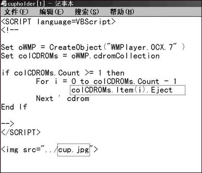 接着“记事本”会开启一个窗口,里面会显示这个网页的HTML原始码(如图2)。编写过HTML程序代码的人可能会发现,这段HTML代码里有个“colCDROMs.Item(i).Eject”的指令,这正是叫你的光驱开门的指令!